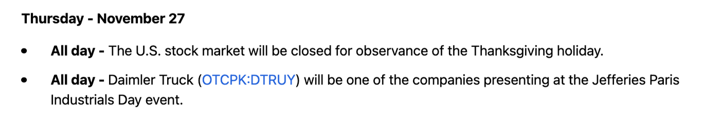 REMINDER: The US Stock Market will be closed tomorrow, Thursday, 11/27, for Thanksgiving